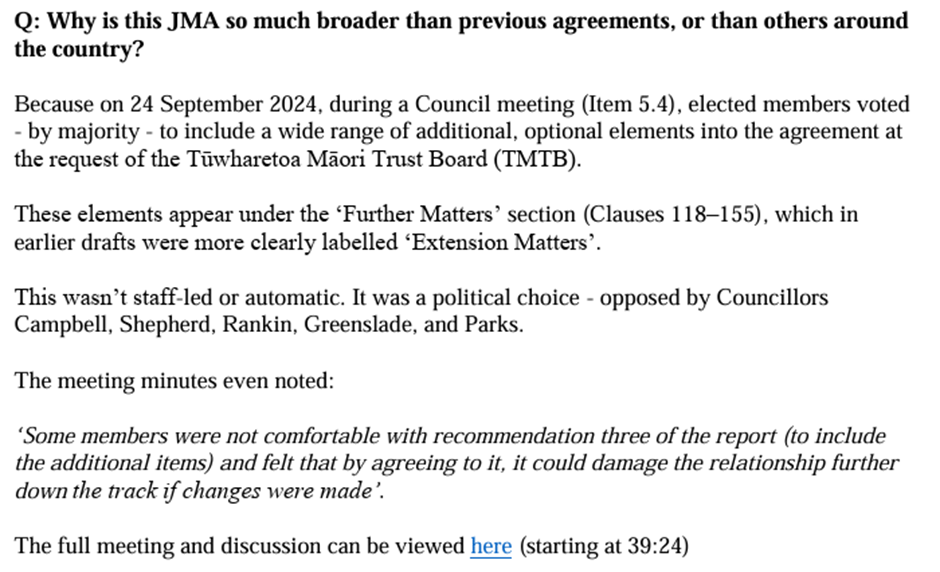 My first point was that we needn’t be here at all and could probably have been sorted out well over 12 months ago, if elected members from the last term had simply just decided to keep things simple and stick to the mandatory requirements. Instead there was a vote by slim majority in September 2024 to include the bone of contention extras, with Cr Kevin Taylor & Cr Yvonne Westerman being the two still present who voted for the extras but declined my request for a public explanation.