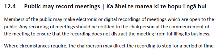Good on ya Bruce, and thank goodness Taupo District Council isn’t as seedy and untransparent as them. And by the way, there is nothing to stop members of the public making their own recordings in a TDC Council meeting – although technically you are supposed to first ask, and below is the relevant clause from our Standing Orders (I can only imagine that the circumstances to justify a directive to stop recording should be extraordinary – yet another unfortunate loophole that could potentially be pounced upon):