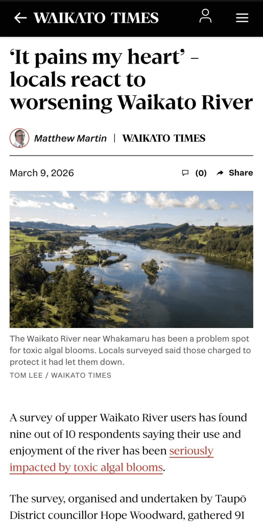 Mango makes the headlines: Mangakino Councillor Hope Woodward is keeping up the pressure to clean up the Waikato River lakes in her neck of the woods, and made page one of this weeks edition of the Waikato Times with an article you can read HERE