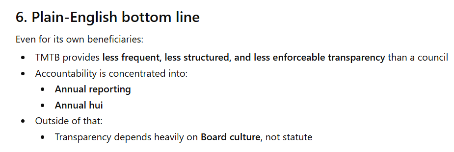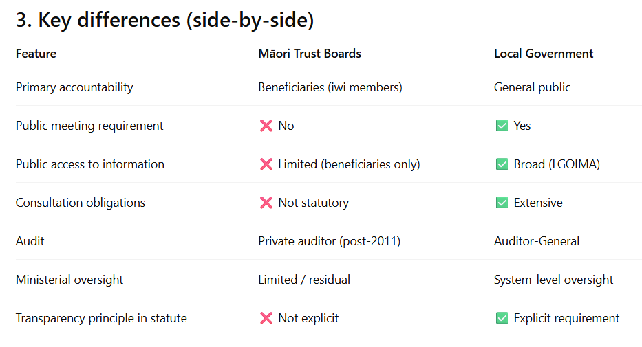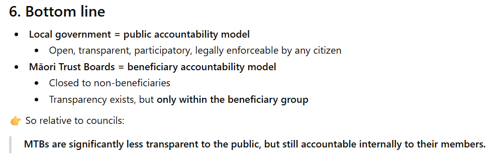 So I decided to do better and ask Chatgpt this question: “What can you tell me please about the legislated ‘transparency and accountability’ of Maori Trust Boards to the public and their own members, relative to the requirements of local government? I have been pointed to the Maori Trust Boards Act 1955 (which was apparently superceded in 2011)”. You can read the full ChatGPT response HERE but here are a few snippets below: