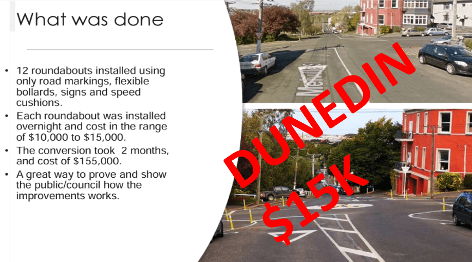 On your second point, I will defer to the Dunedin cheapy roundabout example. They may seem more expedient than the ideal, but the cost of doing nothing has to be weighed up also. Intersections are the flashpoints and bottlenecks of any transport network, and waiting to do the rolls royce option every time is simply not tenable when we have crashes and driver delays happening every day. These are costs to society which is the role of a Road Controlling Authority to duly address, and I was greatly surprised to find after moving here that instead of No.8 wire solutions which I would have expected of an overstretched provincial place, I see the rolls royce happening (and a few road safety disasters as well). That was entirely my original motivation to stand for Council”.