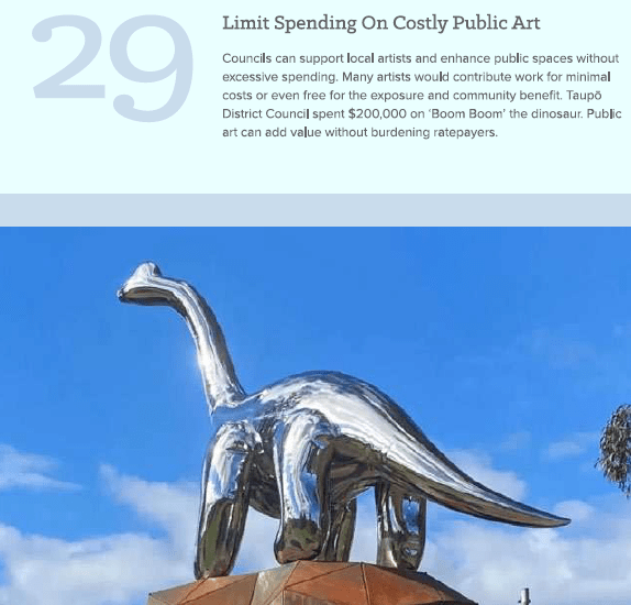 How to save money: The Taxpayers Union are at it again this time with a publication claiming 103 ideas for Councils to save money such as paying back debt, cutting back on Councillor lunches (I can’t agree with that one), and even our own Boom Boom the dinosaur gets a dishonorable mention. Taupo resident Phil Shields pointed this document out to Councillors last week, attached to his quite pointed letter which I thought worth reprinting below. Phil is a retired Council engineer of many decades experiences both in New Zealand and the UK where he originates from, so he knows a thing or two about the dire situation we now find ourselves in. Bring back the days of the City Engineer!