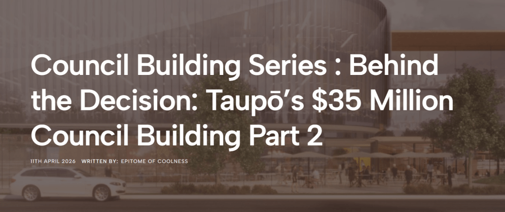 Council building Part 2: Sophie M Smith has put out the second of her series on the Taupo District Council building saga and how it all came to be, which you can read HERE. My own take which I have reiterated many times, is that there was a misguided determination to get a new building come hell or high water, and the demolition of the original Council building happened without any real analysis of the future consequences. I think it would make a great case study for current batch of Elected Members to learn some lessons such as what pre-determined decision making looks like, and how to avoid being led by the nose by staff with an agenda – but I doubt that will happen.