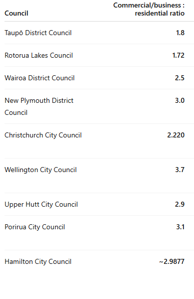 A couple of workshops we did have this week included a workshop on Property Revaluations which you can watch HERE. Not a lot of consequence that I can recall from that, except that one thing which could make a big difference was not a topic of discussion – Differential ratios between business/commercial and residential. The current setting in Taupo is 1.8 and apparently has been for quite some time, and it would take a Long Term Plan (LTP) round of probably controversial public consultation to amend – because changing that figure would shift the rates burden to either side of the equation. So its not something this Council would lightly dare to touch without much consideration, but I think could contemplate. Of interest a Chatgpt scan of settings elsewhere around the country (shown right) demonstrates that figures can vary widely.