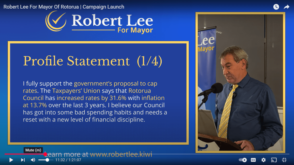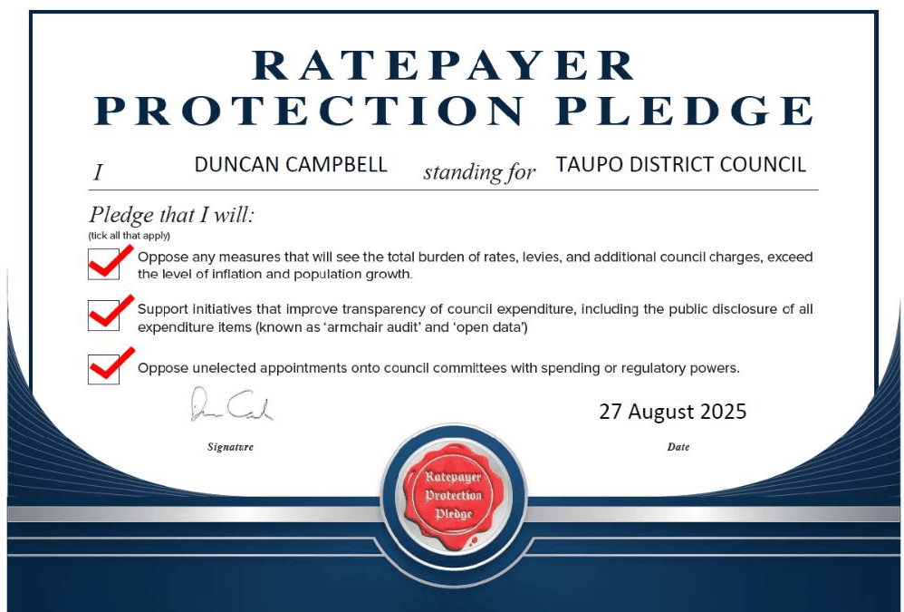 Westwards ho: West Auckland candidate Ken Turner talks for 15 min why he won’t sign the Taxpayer’s Union Ratepayers Pledge to cap rates to inflation, and given Aucklands present commitment to some very large infrastructure projects like the $B Central Rail Link (CRL) he may have a point – but what is the excuse for Taupo? He also has a few things to say about Council’s ‘Reputation Department’, and I’ll let you guess what he means by that.