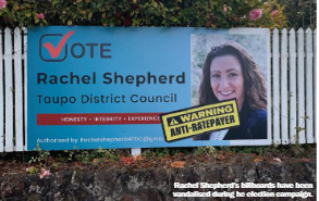 Speaking of Rachel…Recall I reported on the vandalism of candidate placards last week? Well it looks like that beacon of balanced argument organisation Hobson’s Pledge decided to post up their own revised headline to assist people’s understanding, as shown on left.