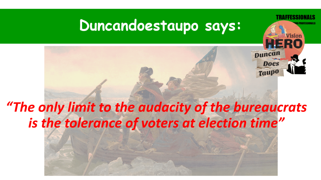 I will leave you with my last statement because I believe it absolutely applies: “The only limit to the audacity of the bureaucrats is the tolerance of voters at election time”. For too long the bureaucrats have had their way and I think the people of Taupo have for too long been brow beaten into a grumbling acceptance. It is high time we took back the reigns.